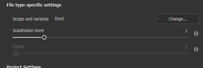 Allows to select a specific part of a USD file. By default, it is set to ‘Root’, which means the entire USD file will be used in the Painter project. Change… opens a new window that displays the content of the USD. If variants are detected, it is possible to select a specific variant to load in the project.Note that -