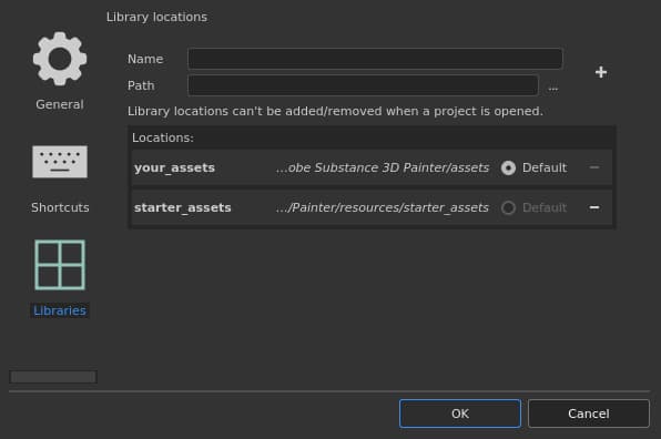 Clicking on this button will add the path defined by the name and path settings to the list below.Adding a new path will automatically create the necessary sub-folders structure needed to organize the data and resources. To learn where to put resources see: Adding Content to the Shelf.