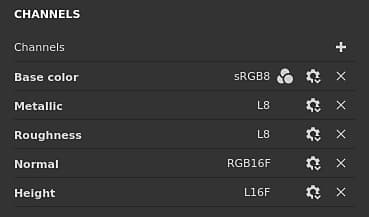 Note: The storage type is not a color space/gamma control. The data used for storing the information of a channel (for example sRGB8 or L32F) has no effect on the way the application will read them. For example the Roughness channel will still be considered as data/raw, and the Base Color will still be considered as gamma corrected. The last action of the menu can be used to enable or disable color management on the channel: