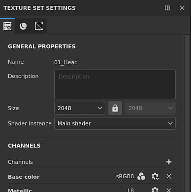 The Texture Set settings control the parameters of the currently selected Texture Set. This is where the resolution, channels and associated mesh maps can be managed.