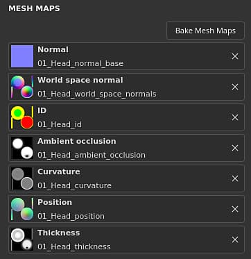 The Mesh maps are baked textures specific to the mesh and Texture Set used to augment the quality of the texturing with the help of filters, Smart Materials and Smart Masks. For more details see the bakingdocumentation.