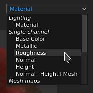 At the top right of the viewport is the display mode dropdown. This control allows to change what information should be visible in the viewport. It allows to display single channels, mesh maps or the final material result with lighting.