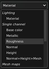 By default the viewport display mode is set to material to show the environment lighting. The dropdown allow to switch the display mode to solo which isolate channels and mesh maps individually.