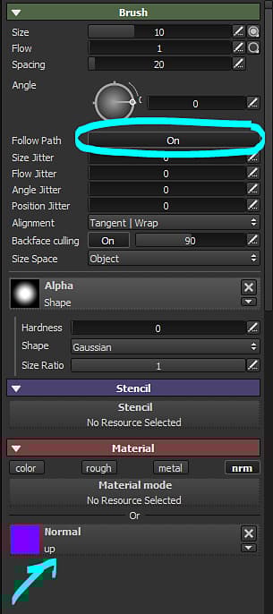 Enable the follow path feature in the brush parameters. Load the normal map texture (step 1) into the normal channel slot. Disable the other channels.