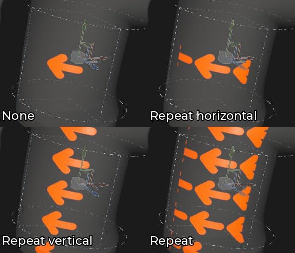 - None: the texture doesn’t repeat. Anything outside the texture is black/transparent.