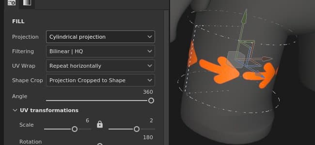 The Cylindrical projection of the fill allows to project images and patterns around an object. It can be useful to fit pillars or columns as well as organic shapes like arms.