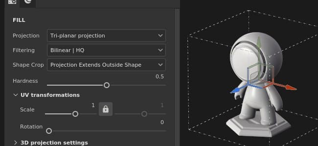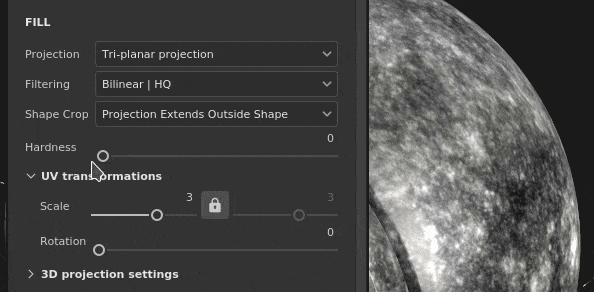 The Tri-planar projection of the fill is a 3D projection that combines multiple planar projections together and blend them to cover the whole 3D mesh. It is very useful to project noises and patterns without creating any visible seams.