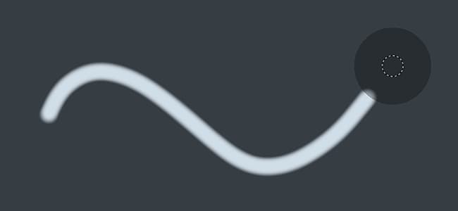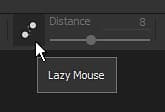 In the contextual toolbar it is possible to change the Lazy Mouse distance. The distance defines a radius at which the brush stamps will be painted from the original paint location. The smaller the distance is, the sooner the stamps will be painted which allows quick turns but reduce the smoothing of the painted line.