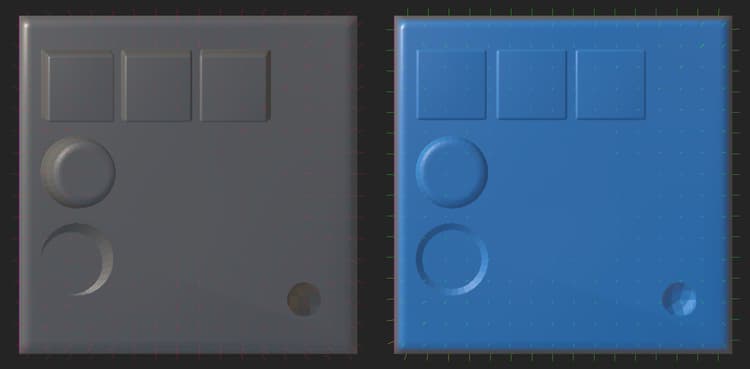 Above, the mesh on the left displays visible distortion due to surface normal misalignment near hard edges. The same mesh on the right with a painted skew map shows no more distortion, and normals are perpendicular to the surface, except near the edges thanks to edge protection.