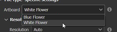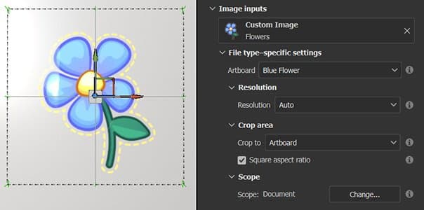SVG and Illustrator documents share similar settings, notably the resolution, crop area and scope selection parameters. This means that vectorial resource can be managed in a similar way.