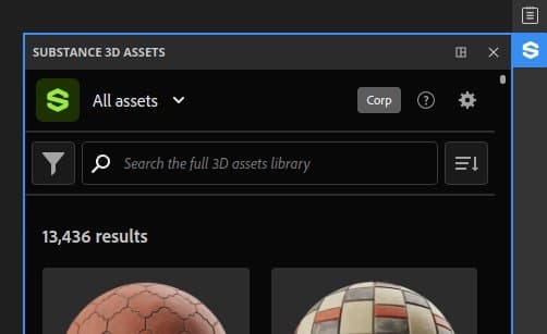 A new dock is available in the interface to browse Substance 3D Assets. If the dock is not visible and closed it can be found again in the dock toolbar on the right of the interface.