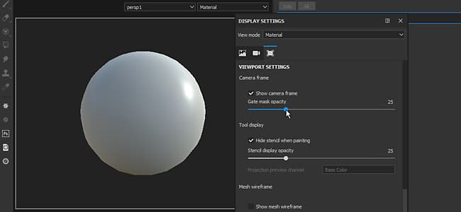 The camera frame (and it’s gate) is also taken into account, making it possible to view and paint via a very specific point of view. The frame and gate are displayed over the 3D Viewport and its opacity can be controlled in the Viewport Settings from the Display Settings window :