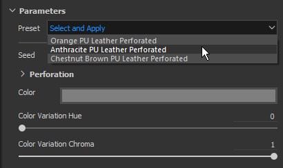 If a Substance file contains one or more presets, a new dropdown in the parameter list will be available. Select which preset to apply to update the parameters.