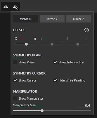 - Manipulator : Show Manipulator will display a manipulator in the viewport to offset the symmetry plane. Manipulator Size controls how big the controller will be in the viewport.