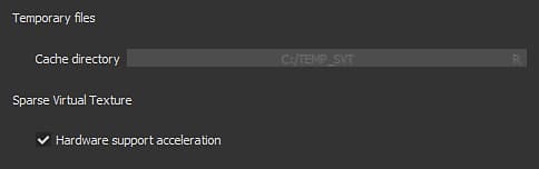 - Hardware support acceleration : If enabled, Substance Painter will use the native support of Sparse Textures by the GPU (if disabled it will fallback on a software implementation)
