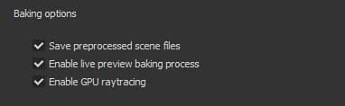 With compatible hardware the bakers can now compute directly on the GPU which drastically reduces computation time, especially when anti-aliasing is enabled and lots of rays are defined. DXR is the default option when available, otherwise Optix will be used. It is possible to disable GPU Raytracing by going into the main settings and looking for “Baking Options” :