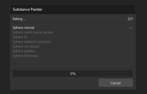 Canceling in-progress baking The baking process doesn’t lock the application anymore. Substance Painter is now more responsive, meaning it is possible to cancel a bake that is currently in progress without waiting for it to end. Cancellation is not immediate however and may require a few seconds to take effect. This is because internally the baking process works on textures in chunks and cannot stop while a chunk is being computed. When canceling the baking process, the Baking window automatically reopens.