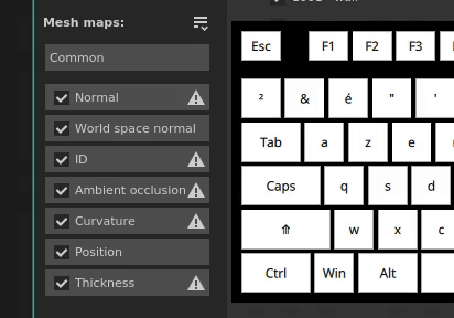 The list of mesh maps in the baking window can now be isolated with the Alt + mouse click to isolate a specific map to bake, instead of having to exclude them manually. The same shortcut can be used to re-enable all the mesh maps.