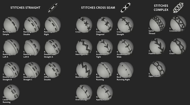 Three new stitch tools have been added in this release and can be used to create complex patterns and realistic stitches. To find them, simply go in the Tool section of the Shelf and look for: