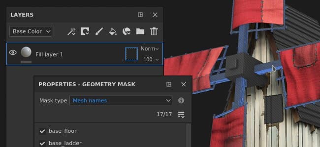 The Geometry Mask is a new masking tool in the layer stack that allows to hide geometry based on mesh names or UV Tiles. It is an evolution of the previously named UV Tile Mask that masked geometry based on UDIM numbers.