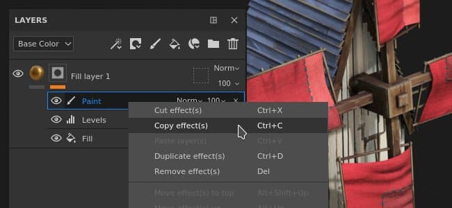 Right-click on any effect in the layer stack of a Texture Set and choose the cut or copy action. Then right-click again on any layer and choose paste to move or create a copy of the desired effects. We also took the opportunity to rework the contextual menu and give access to more functionalities: