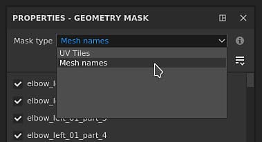 At the top of the Geometry Mask properties is a dropdown that controls the masking mode. It is possible to choose between masking by UV Tile number or by mesh name. This dropdown is disabled and set to mesh name only in case a project doesn’t use the UV Tile workflow.