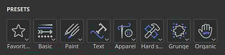 A series of new buttons now sits at the top of the Properties window when using any path tools. Each button gives access to tool presets, sorted per categories. The favorites category regroups presets you chose.