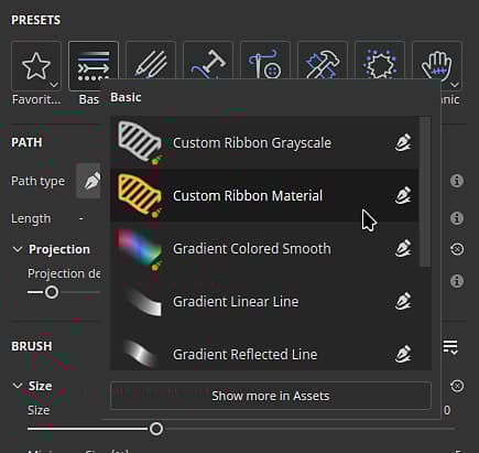 Clicking on one of the buttons will give a quick access to some pre-selected presets. Clicking on Show more in Assets will reveal more path tool presets in the Assets window.