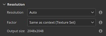 - Resolution: define the mode and context used to compute the resolution. Default is Auto, but it can set to Texture Set or Custom.