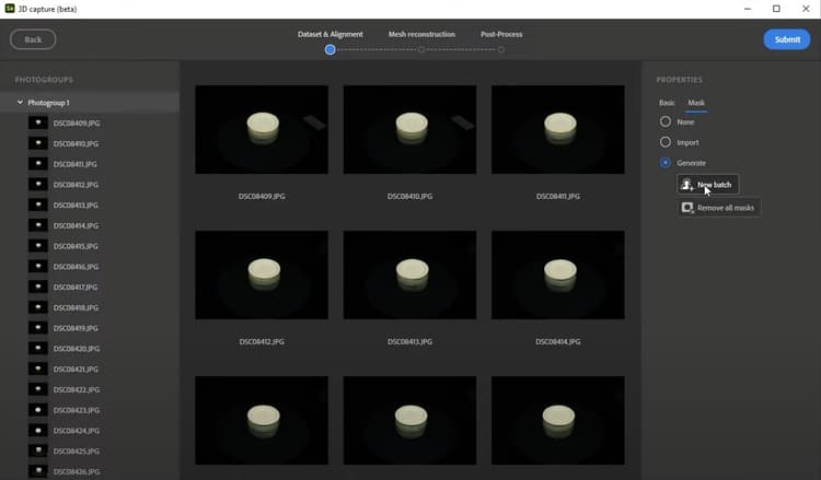 You might retry a dataset multiple times, and you want to avoid re-generating your masks each time, as Sampler deletes these once you close the app. Your masks are cached In your Documents\Adobe\Adobe Substance 3D Sampler\3DCapture\p1. If you do multiple assets in a session, you will get folders called p2, p3, etc. It’s a good idea to copy the cached masks to a safe location with your dataset, so you can save time if you need to revisit this dataset.