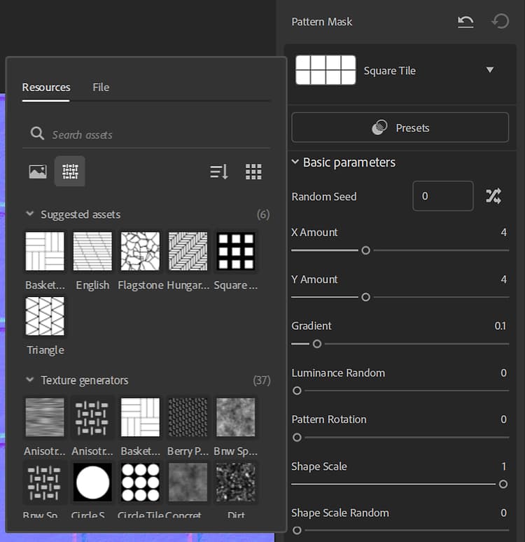 Texture generators give improved control over material creation using parametric noises, patterns and grunges options. The generated imagery can be used in masks or channels maps.