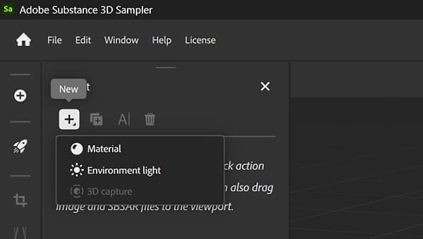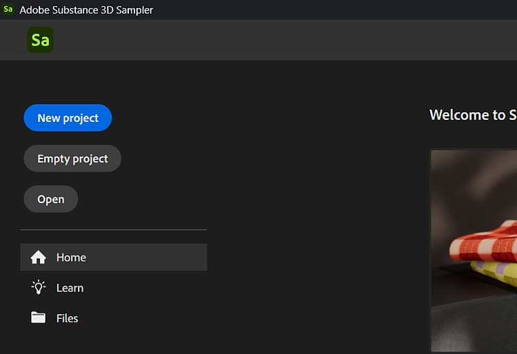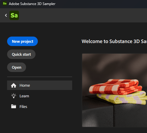 To create a new project, select Create new in the Home screen or File > New Project. Creating a new project will launch the Quick Start dialogue, where you can select a quick action or import an image or Substance file to start your project.