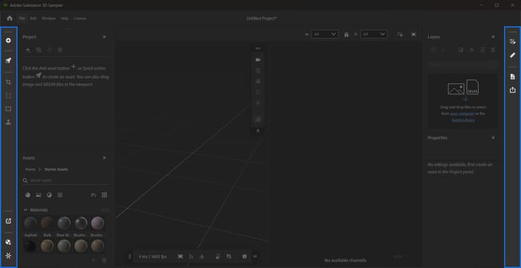 The Get content button: import assets directly to the layer stack or to the Assets panel, or visit Substance Source to get more assets.