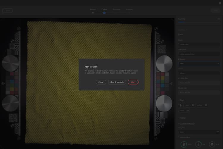 If you have made captures previously, the material category, outputs and capture resolution selected will be the same ones as your previous capture.