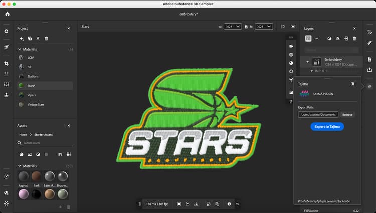With this first proof of concept, you can now transfer their digitally embroidered designs from Adobe Substance 3D directly into Tajima DG17 embroidery software—eliminating the need for time-consuming manual digitization.
