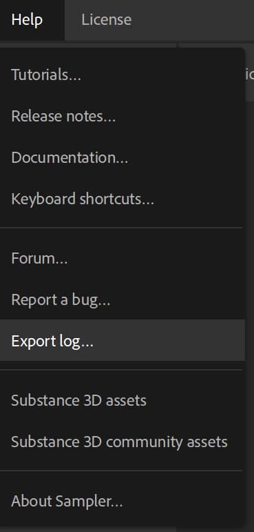The log file can be directly exported from Substance3D Sampler by going to the Help menu and selecting the Export log file item.