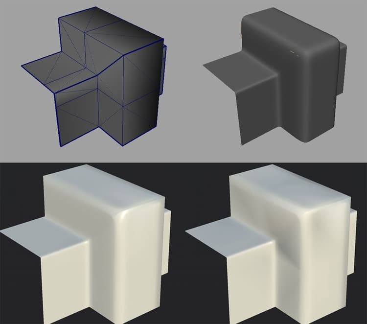 At the bottom is the low-poly with the normal map baked from the high-poly. The mesh on the left use a triangulation identical to the one used by Substance Painter when baking. The mesh on the right doesn’t and display black artifacts. This is because there is a mismatch between how the normal map was baked and how the mesh is currently triangulated. This can be fixed by updating the mesh and/or rebaking.