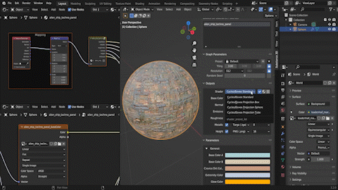 The shader preset can be quickly adjusted via the dropdown in the Outputs section of the Substance 3D Panel. These shader presets adjust the way that image textures are applied.Cycles/Eevee Standard uses regular UV texture coordinate mapping. The other three Cycles/Eevee Projection presets use generated texture coordinate mapping for box, sphere, or cylinder projection methods.