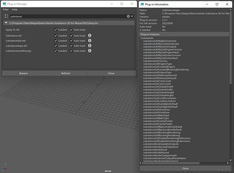 The Substance in Maya plugin can be scripted. An exposed API allows Substance commands to be used in scripts for creating and managing Substance materials. You can access the available commands by going to the plugin information.