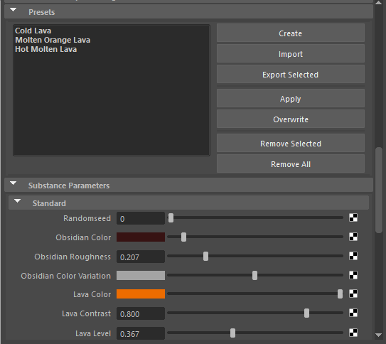 To create a preset, make any changes to the Substance Parameters and then click the Create button.