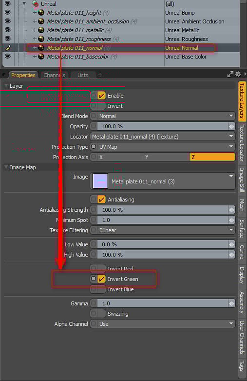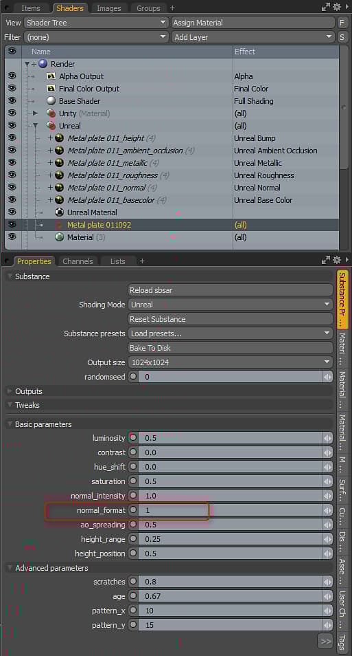 Stock Substances are built to use DX normal orientation. However, MODO uses OGL. You can flip the normal by setting the Normal Format parameter to 1.0. The Substance Plugin will only interpret the parameters set in the Substance. You may encounter a Substance that doesn’t have the “normal_format” parameter as it’s up to the author of the Substance to add this control to custom Substances. If you encounter a Substance that doesn’t have this parameter, you can flip the green channel on the normal map’s Texture Layer to fix the orientation.