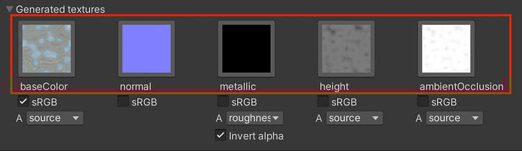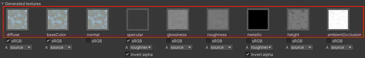 The Generated Textures show the outputs from the Substance that are computed by the Substance Engine to create textures. These textures are fed into the shader inputs. By default, the only the base inputs used by the shader are created. If “Generate All Outputs” is enabled, all of the textures will be shown here.