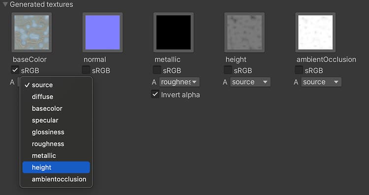 You can pack a texture into the alpha channel of another texture using the drop-down menu. Each generated texture has a drop-down menu that contains a list of all of the texture outputs generated by the Substance materials. Simply choose a map from the list to pack it into the alpha channel of the texture. The Source option is the alpha channel of the texture.