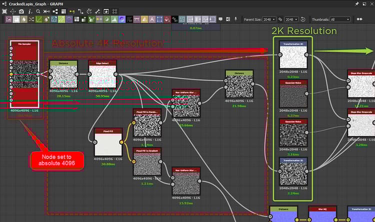 In the following example, a Tile Sampler node’s output size is set to Absolute 4096. It causes several nodes downstream to compute at 4K before being down-scaled for the final 2048 output resolution.
