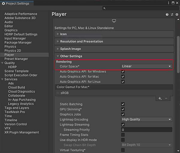 In the Rendering section, change the Color Space to Linear. (Unity defaults to Gamma space, which is incorrect and will result in your texture color looking wrong).