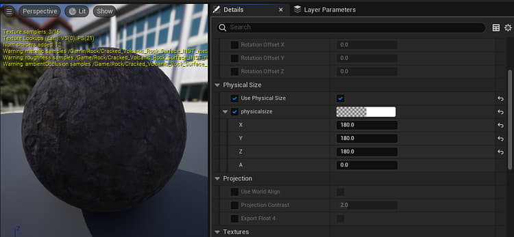 As there is no displacement value in materials in UE5, the physical size template copies the value as X, Y, X for the triplanar map.