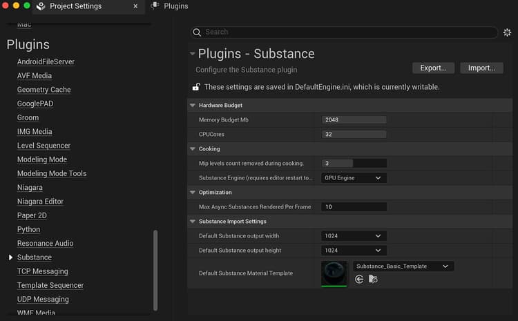 To access the settings, go to Edit>Project Settings and scroll down to the Plugins category and click on Substance.