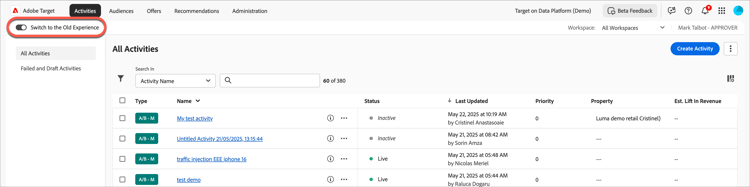 Adobe Target now includes a new insights dashboard that provides a high-level view of how your organization is using Target for experimentation and personalization. The dashboard surfaces key metrics such as live activities, activities live and modified, completed activities, published activities, and A/B testing activity. Use the time range selector to explore trends over different periods, including a recap view for 2025. This dashboard remains available as an ongoing way to track adoption and activity over time.
