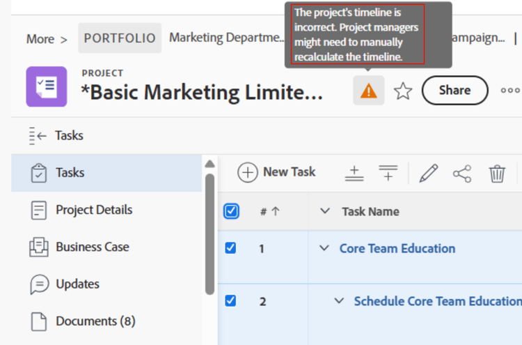 Workfront places a warning to the right of the project name on the project page to advise users that the project timeline must be recalculated manually. Only users with Manage permissions to the project can manually recalculate the timeline.