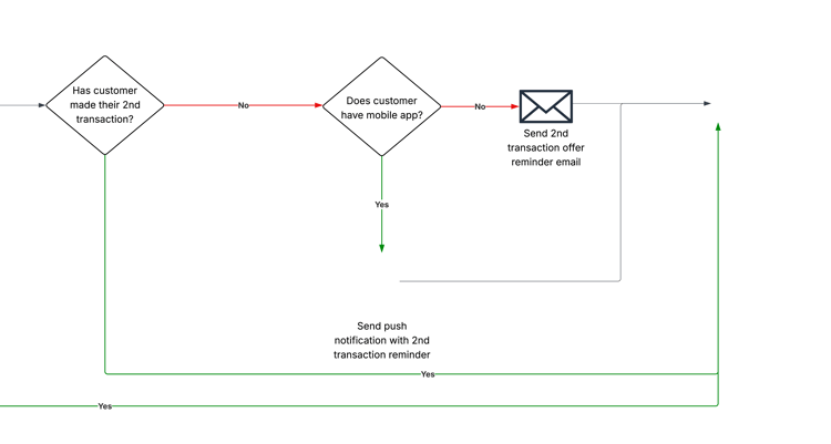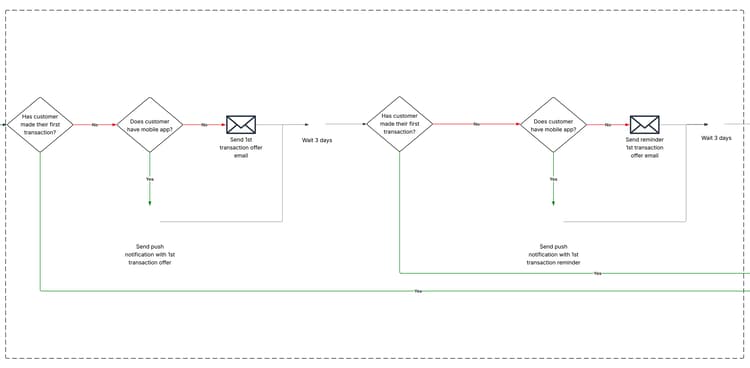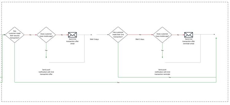In this example, customers are guided through three milestones using two marketing channels. The journey strategy is straightforward: an initial communication is sent, followed by a reminder after a few days if the customer has not completed the intended milestone within that period.